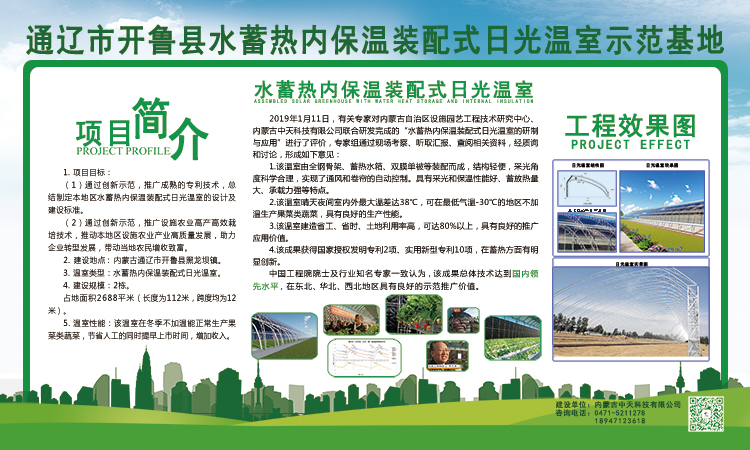 1.通過創(chuàng)新示范,推廣成熟的專利集成技術及產(chǎn)品,總結制定內(nèi)蒙古通遼市及周邊地區(qū)水蓄熱內(nèi)保溫裝配式日光溫室的設計及建設標準。