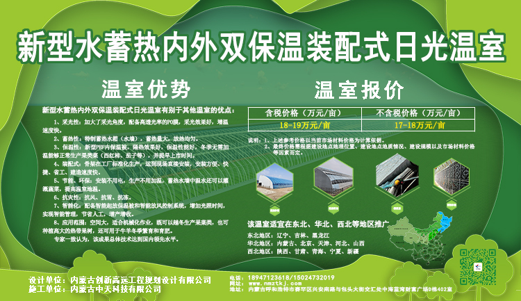 水蓄熱內(nèi)外雙保溫裝配式日光溫室是由內(nèi)蒙古農(nóng)業(yè)大學(xué)與內(nèi)蒙古中天科技有限公司聯(lián)合研發(fā)完成,并已在東北、西北、華北等地區(qū)進行了大面積的示范推廣。該溫室集成了10多項國家專利技術(shù),實現(xiàn)了北方寒冷地區(qū)冬季不加熱正常生產(chǎn)果菜類蔬菜,對于推動設(shè)施蔬菜產(chǎn)業(yè)發(fā)展及帶動當(dāng)?shù)剞r(nóng)民增收致富有著非常重要的意義,該溫室具備以下特點: